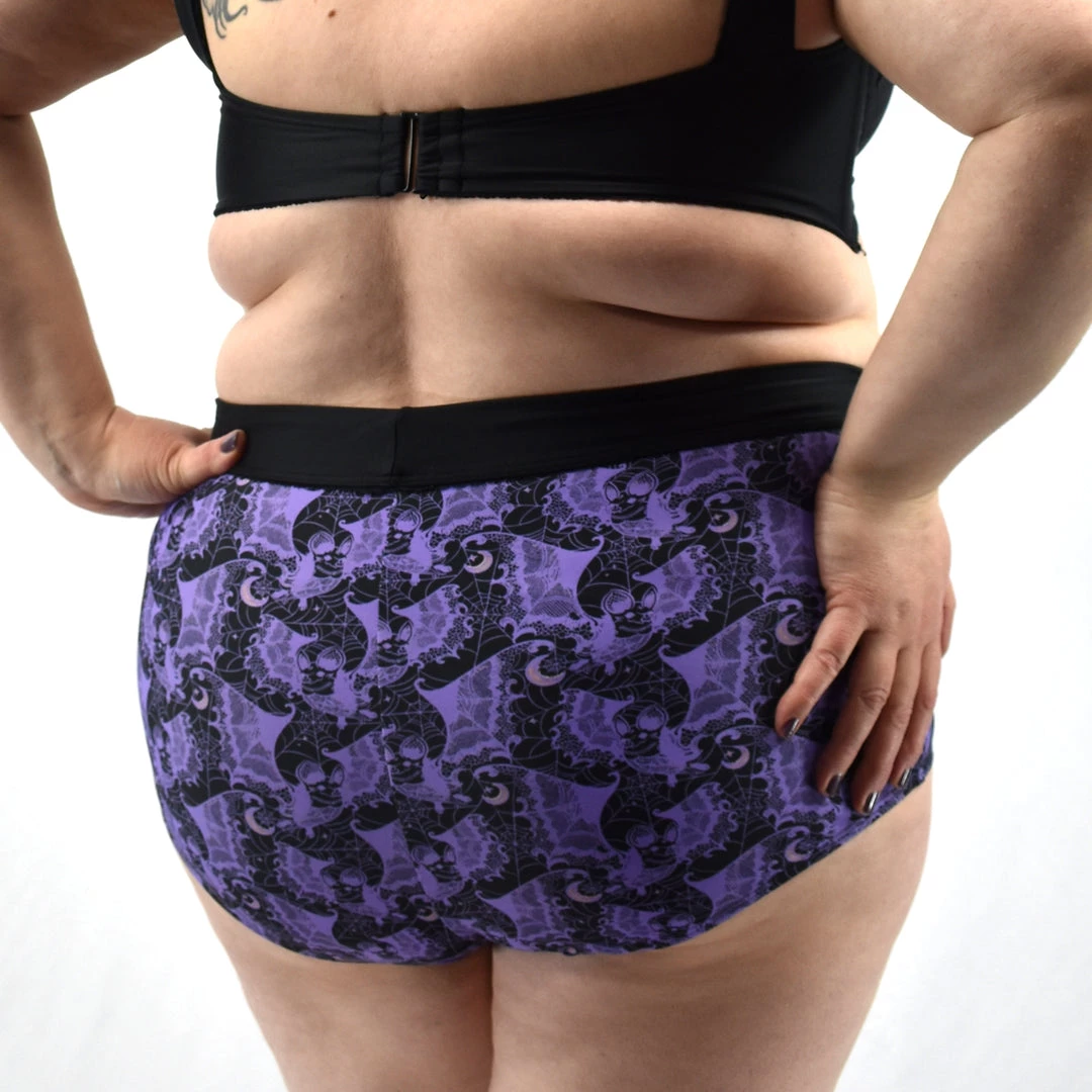Spooky swim at its absolute best. These high waist swim bottoms feature a print of spiderwebs, crescent moons, and purple bats with lace wings throughout. Stand out in vintage vibrance in fully mesh lined comfort. Perfect for catching the moonlight!