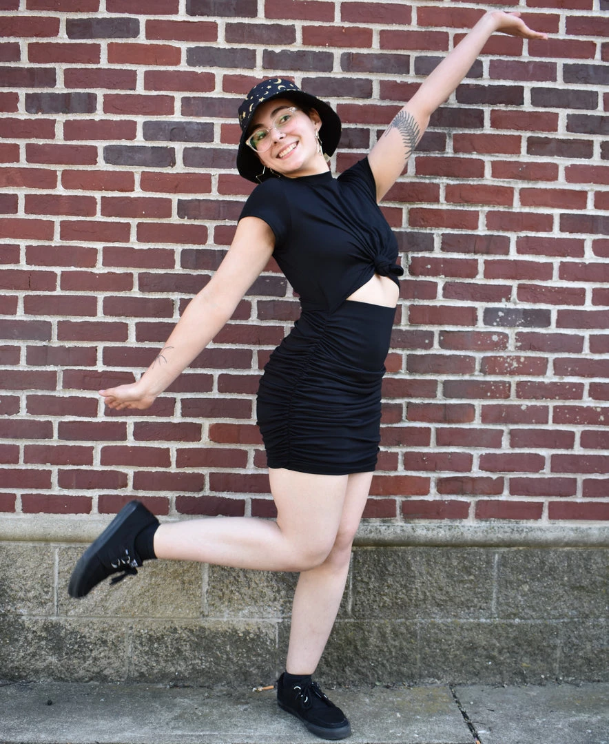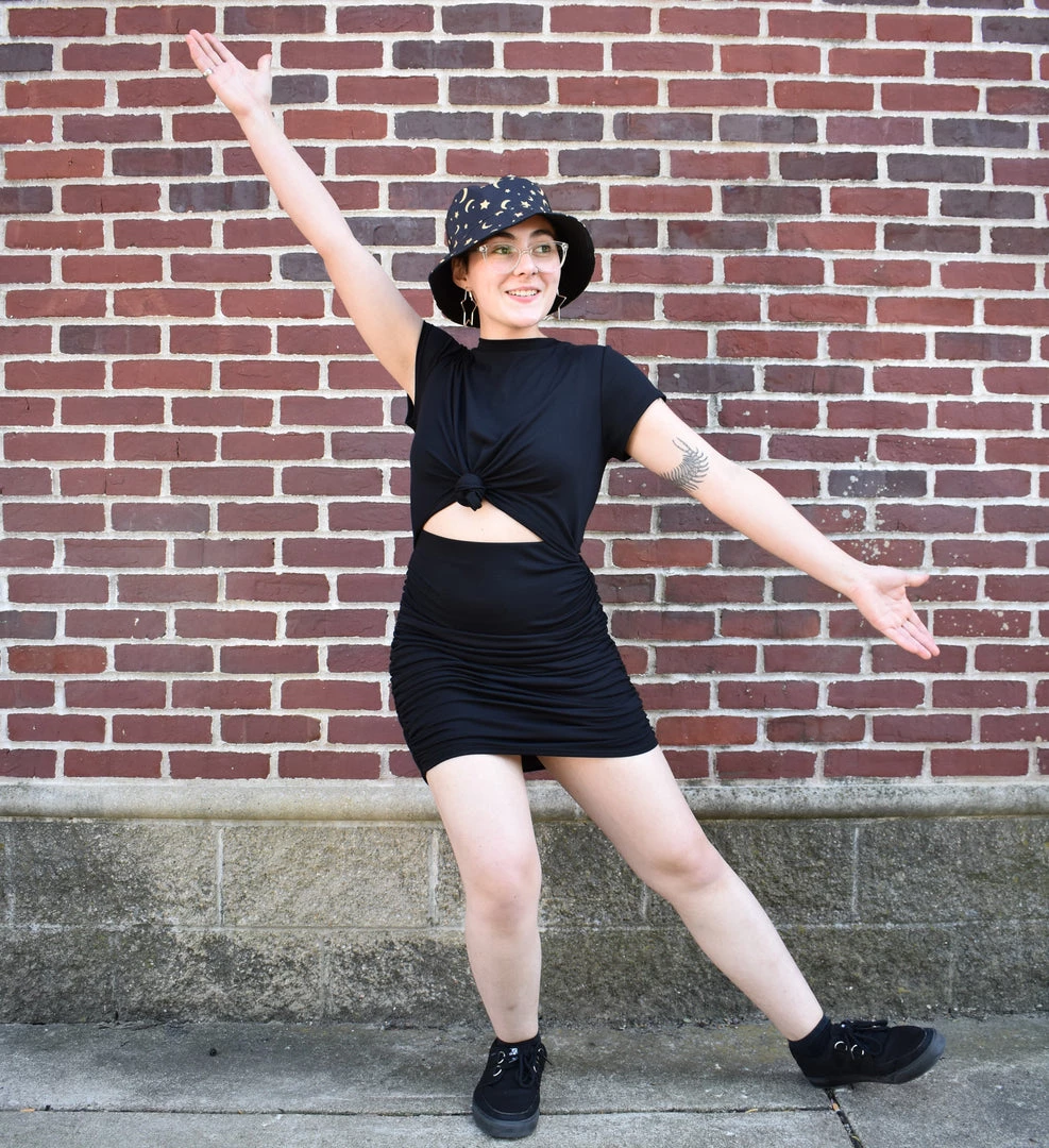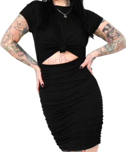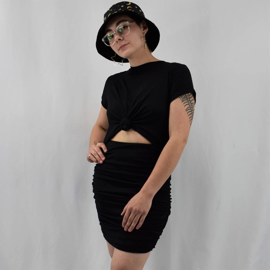 This black bodycon dress has the appearance of a 2 piece dress with a knot tie cut out in the middle.