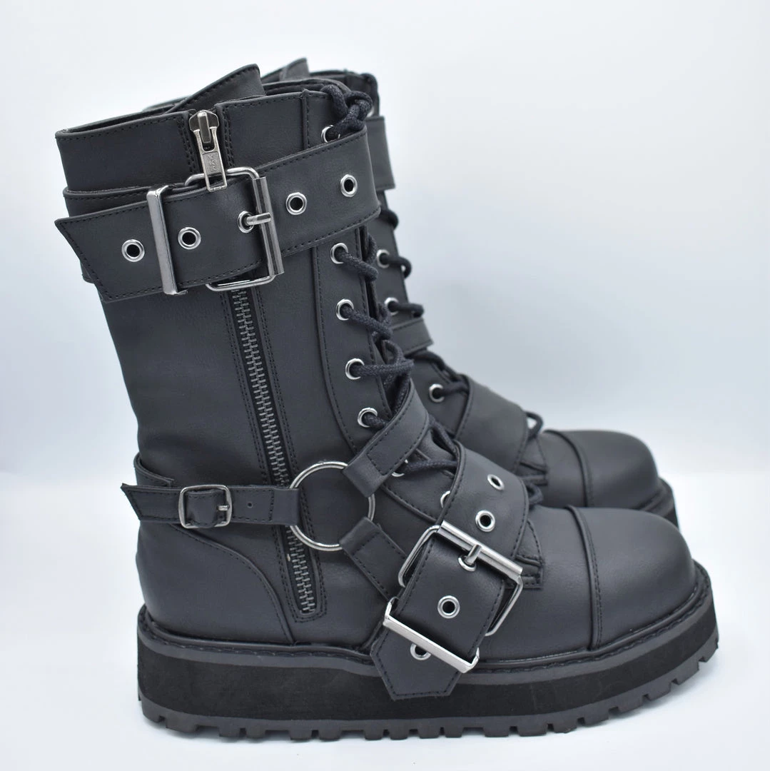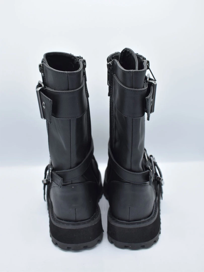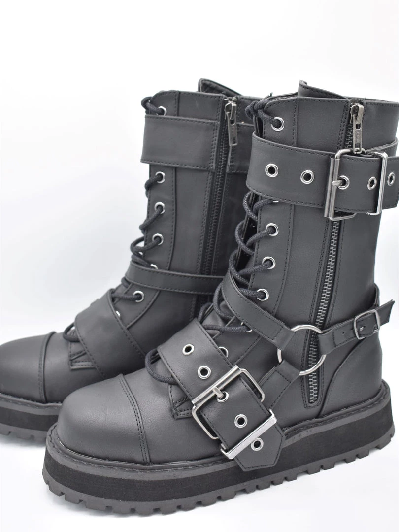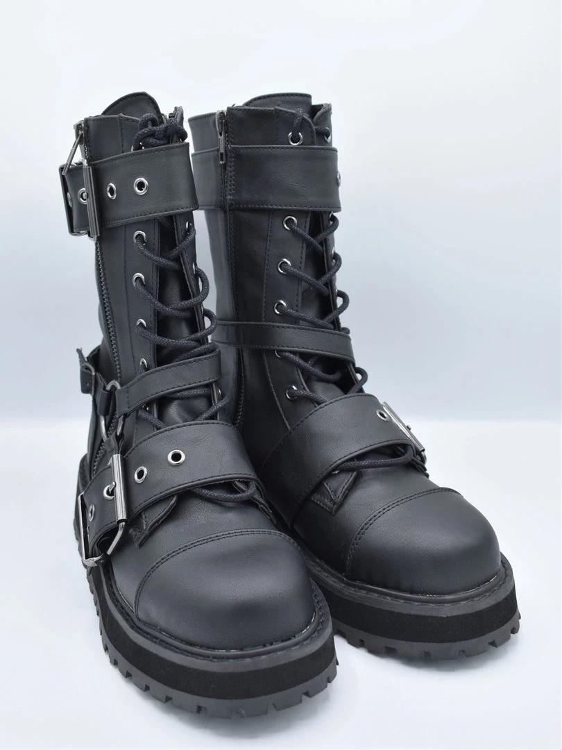 1.5″ platform lace-up mid-calf boot featuring harness strap, ornamental metal zipper at the outer side and two buckle straps. Inside metal closure zipper.