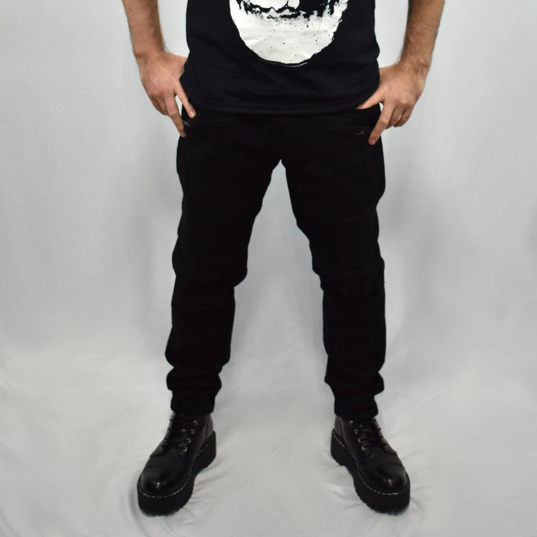 When you want the look of cool moto denim without the tattered look of distressed jeans, these are the pants for you! Skinny fit stretch denim with rib quilt above knees, five pockets, and button closure on zip fly.