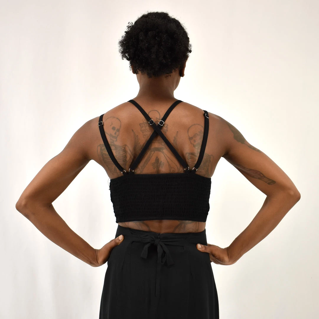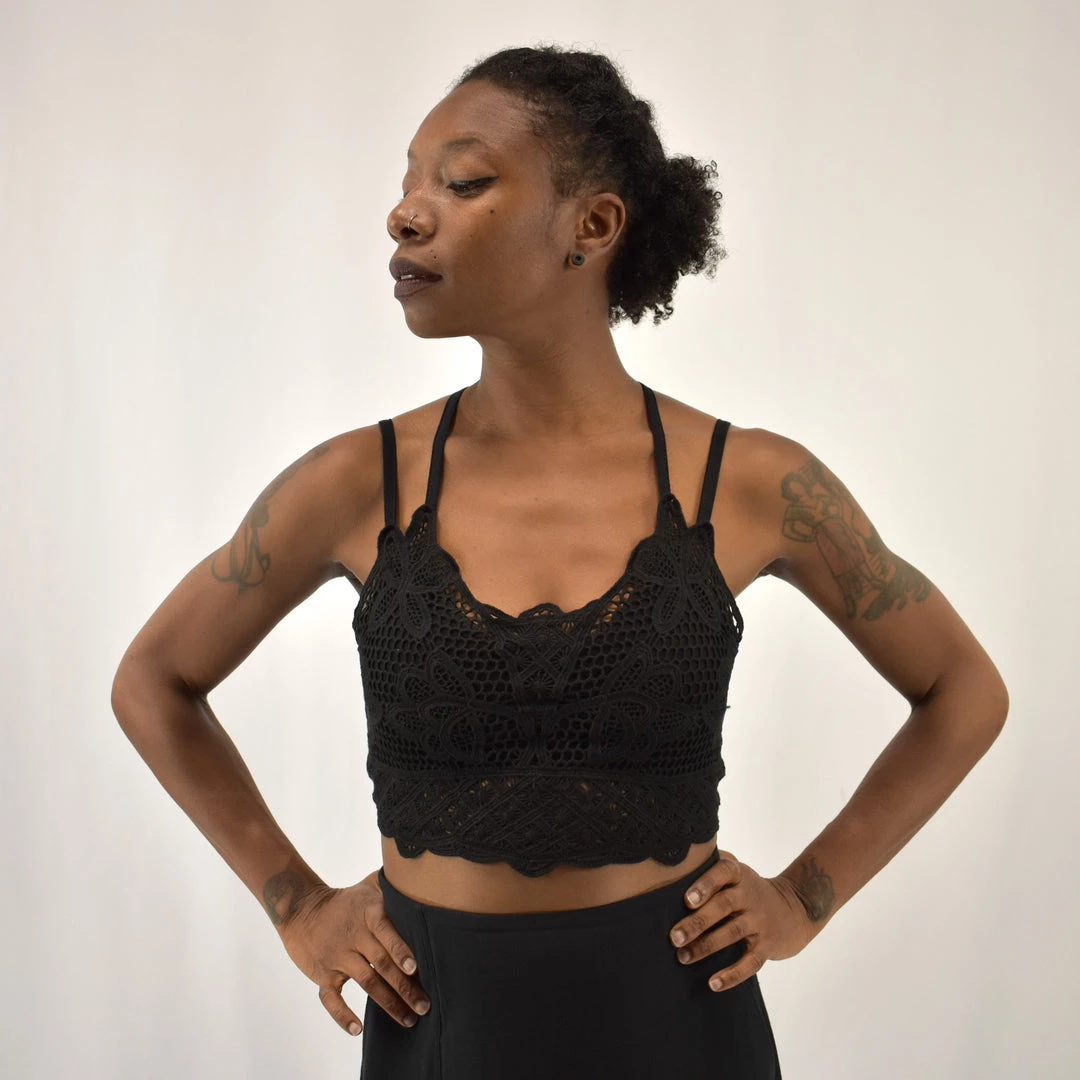 A crocheted lace bralette with a sweetheart neck featuring double adjustable straps with crossed back detail, attached bra cups, and smocked elastic back. Perfect to wear as a bralette or a cropped tank top.