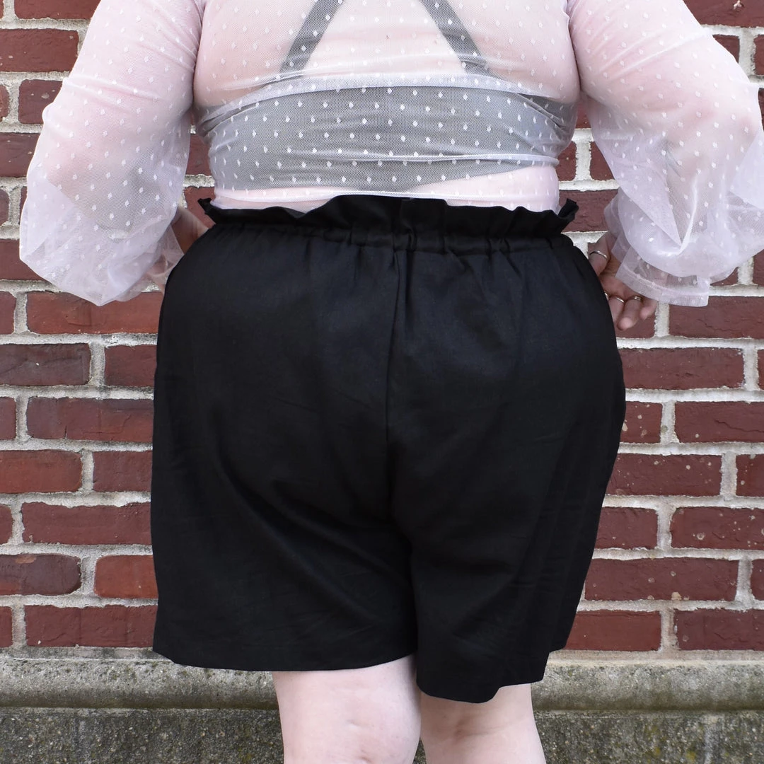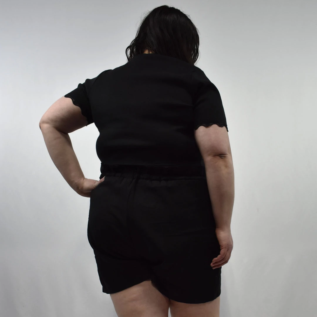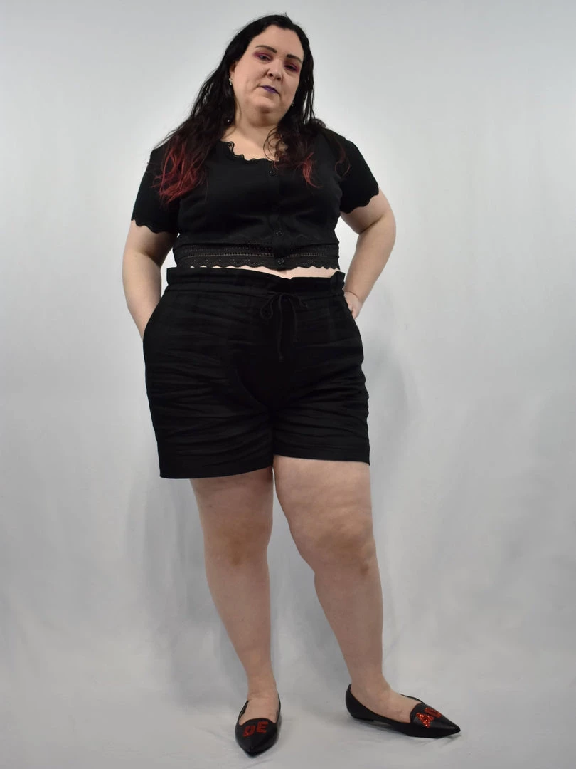 A high-waisted solid woven short with an elastic waistband and adjustable front tie. Side pockets. Fabric is a lightweight woven linen material.