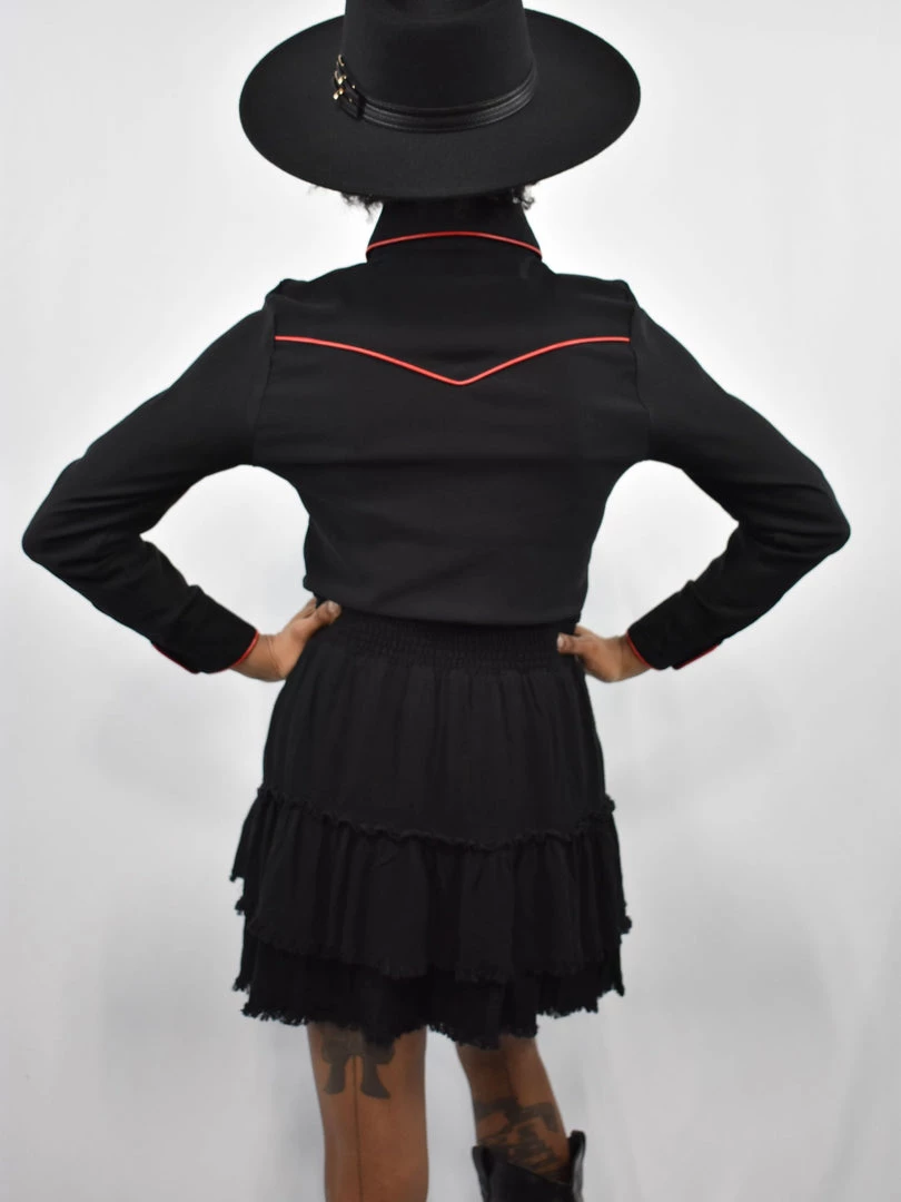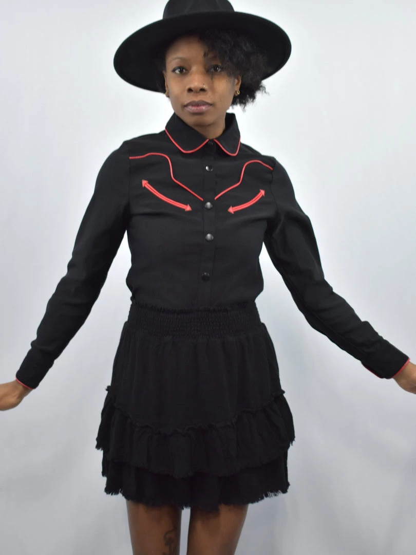 Ready for an adventure! Whether it’s a night at the goth club, an afternoon line dancing, or a trip to the ren faire, this versitile skort has you covered. This high-waisted solid woven skirt with a smocked elastic waist featuring a tiered body and a frayed hemline has shorts hidden underneath. Fabric is a lightweight cotton-linen blend.