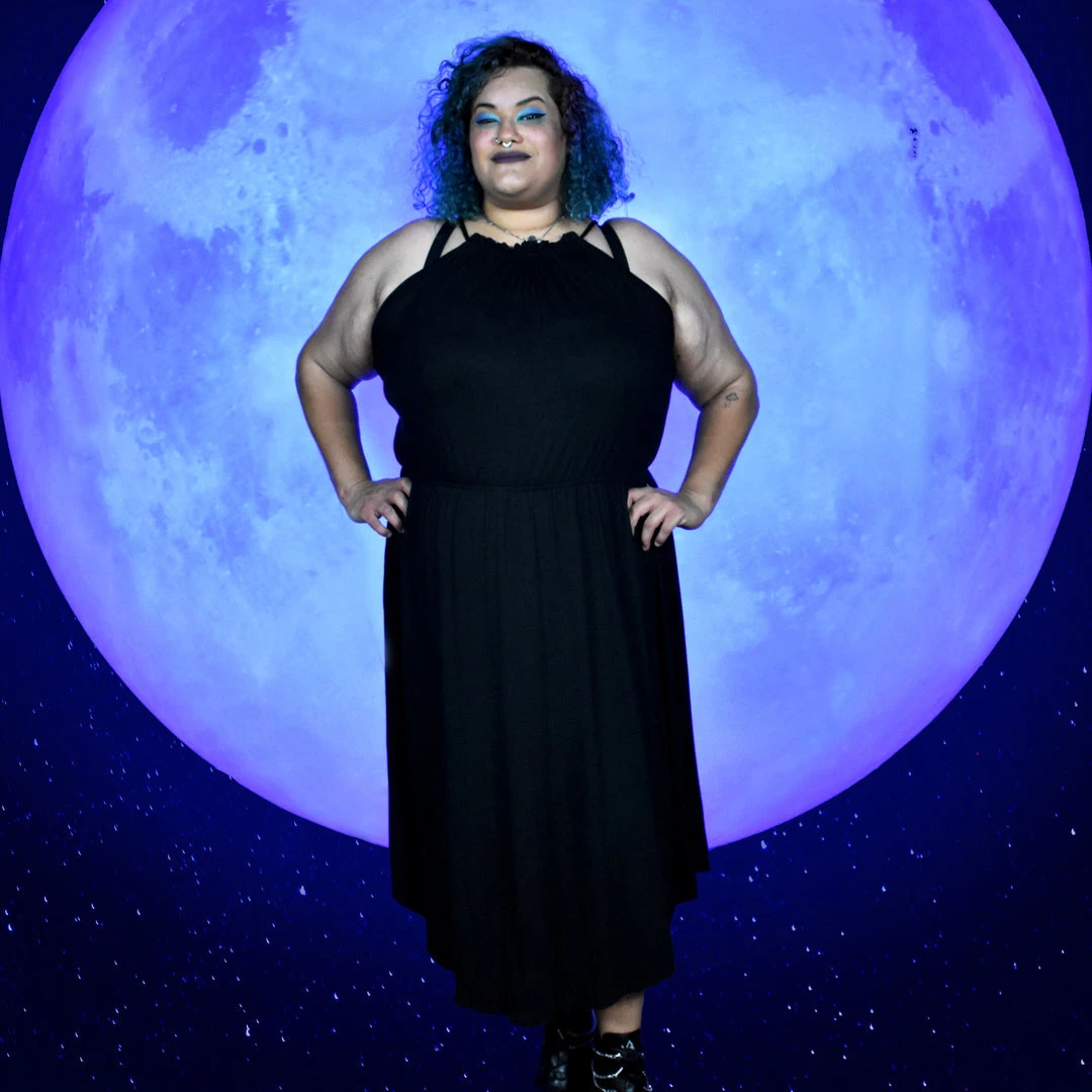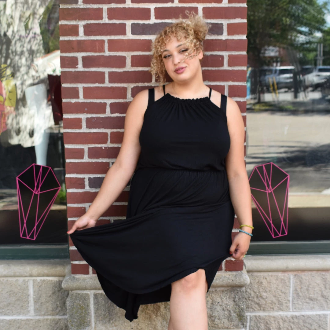 The perfect lightweight knit dress for the last hot hazy days of summer and an evening stroll through the cemetery. Gathered neckline, adjustable halter tie neck closure with keyhole at back, elastic waist, and round hem.
